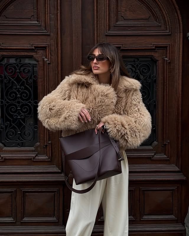 What better way to make a statement than with a voluminous shearling jacket? Cozy meets corporate in this perfect collab. Add ivory trousers to keep the beige color and soft texture of the jacket looking ultra-refined.