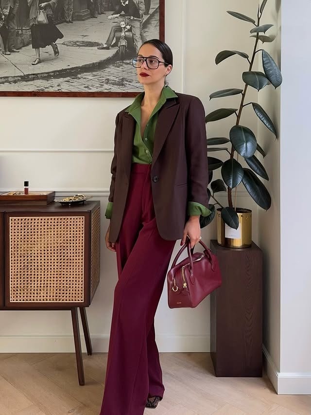 Consider this your color theory power move. This look redefines the power suit through deep colors and bold contrast. Burgundy trousers flow with tailored precision, complemented by a forest-green blouse that peeks from under a chocolate blazer. This autumn edit shows that a pop of color can still mean business.